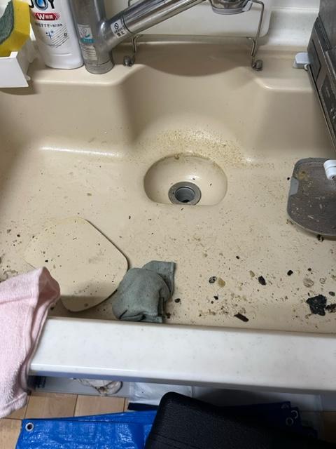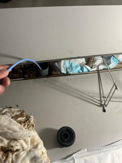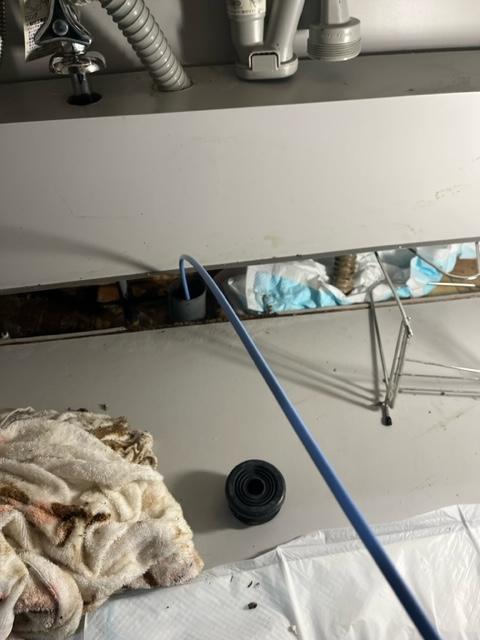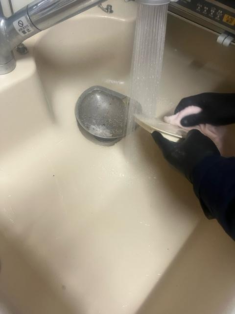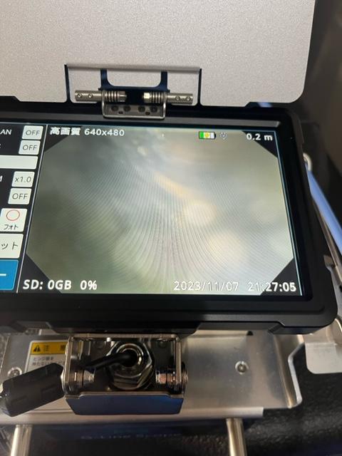 内視鏡で配管内部を確認した所、完全に流れない状況です。高圧洗浄していきますが、気をつけてやっていかないと溢れます。バケツに異物を取りながら高圧洗浄実施しました。